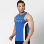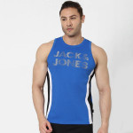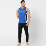 Blue Colourblocked innerwear vest has white and black typography detail, has a round neck and sleeveless