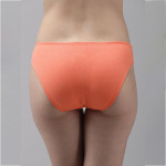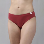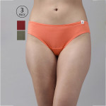 Three solid mid-rise bikini briefs in maroon, olive green and coral pink, each has an inner elasticated waistband, and double-layered gusset